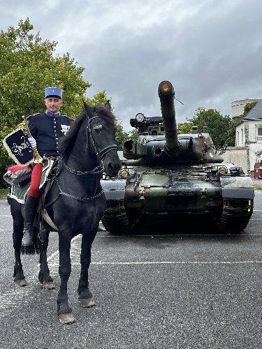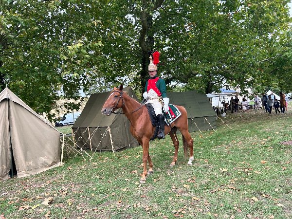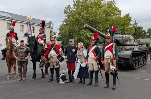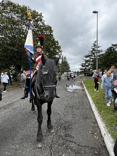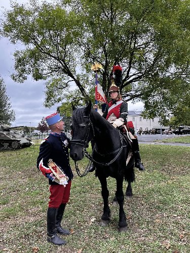 Nous avons été invité à « défiler » avec le régiment officiel avec « notre étendard » et notre trompette a sonné lors de la cérémonie, sous les ordres de l’adjudant chef trompette du régiment et de son trompette. Ci-joint la photo souvenir du weekend avec le colonel Scarpa, 116e chef de corps Condé Dragons et de l’adjudant-chef trompette Fred Etavard .