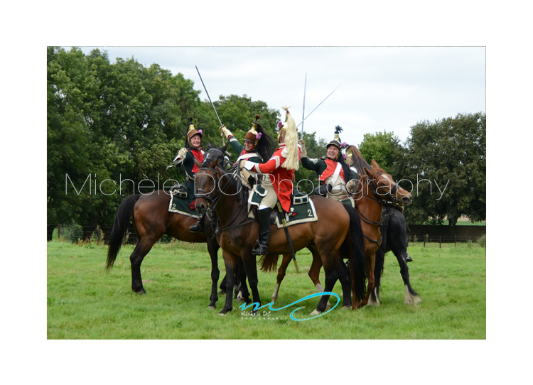 Nos évolutions reproduisent l’entrainement militaire des cavaliers: Le premier rang pointe le sabre vers l’avant tandis que le second rang pointe le sabre vers l’arrière pour éviter “d’embrocher” le cavalier de devant dans le cas où son cheval s’effondrerait.