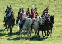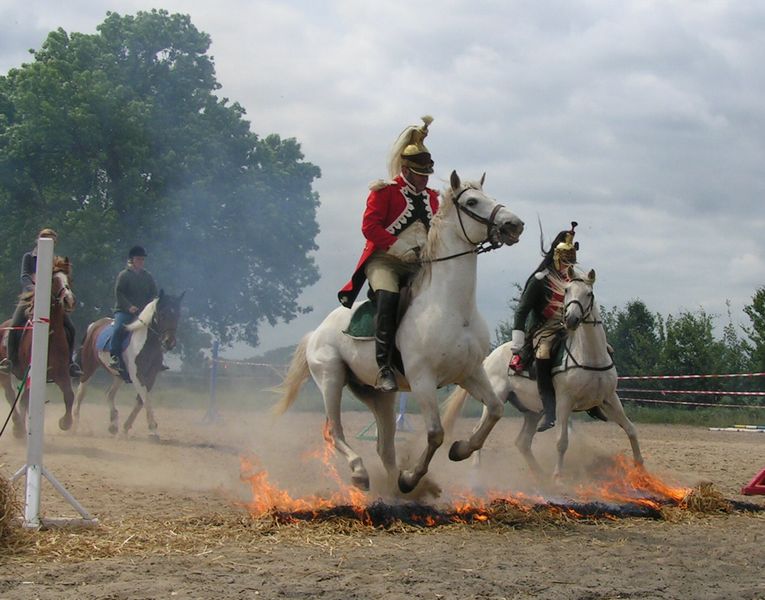 Par une prise en mains appropriée des chevaux, nous leur donnons confiance de manière à les faire évoluer dans un contexte qui leur apparaît comme hostile.(coups de canon, tambours, fusillades, duels, défilés parmi le public)