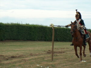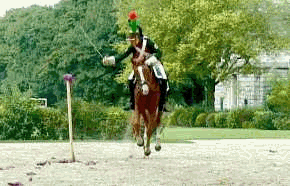 Ensuite, nous habituons le cheval aux mouvements du sabre, à la présence éventuelle de tambours, d’uniformes colorés, de personnes apparemment hostiles, et du bruit des fusils et des canons.