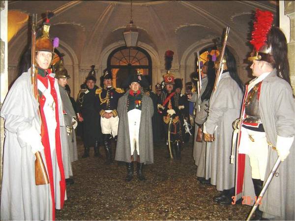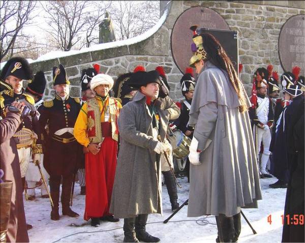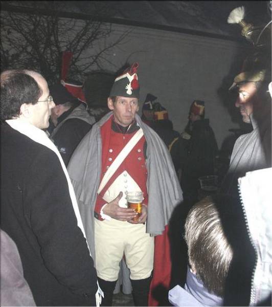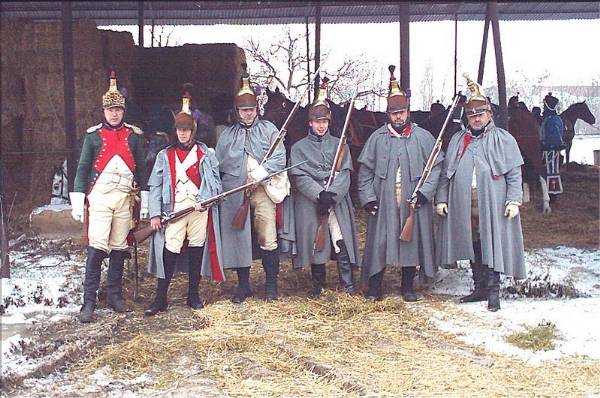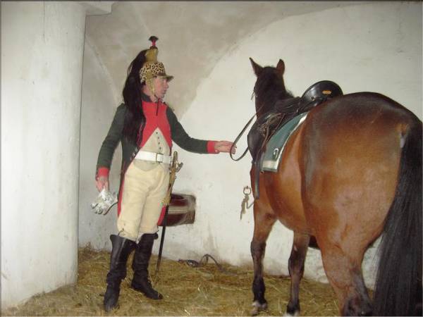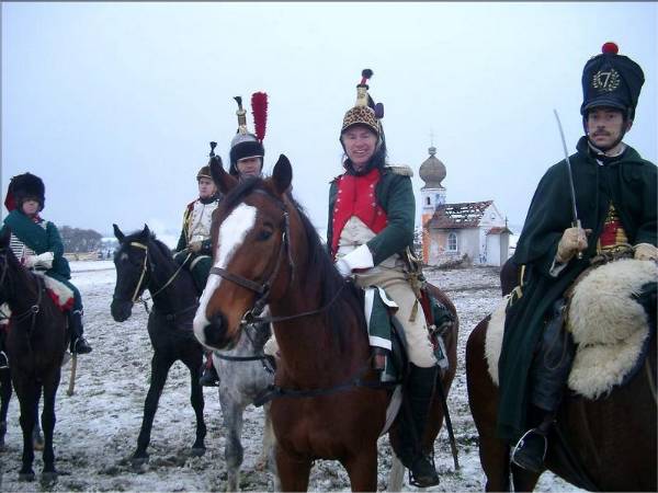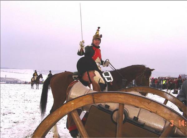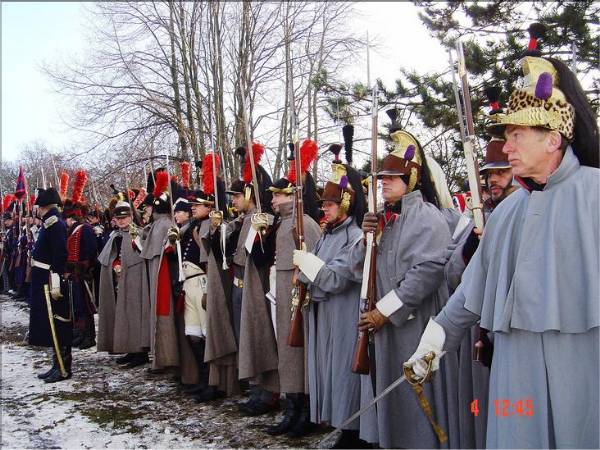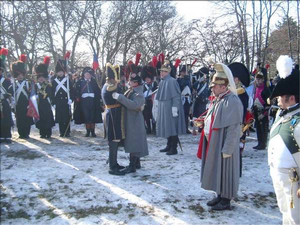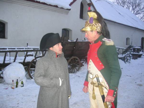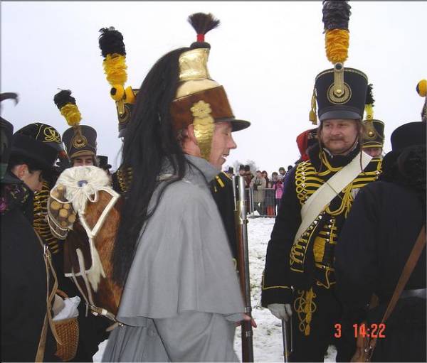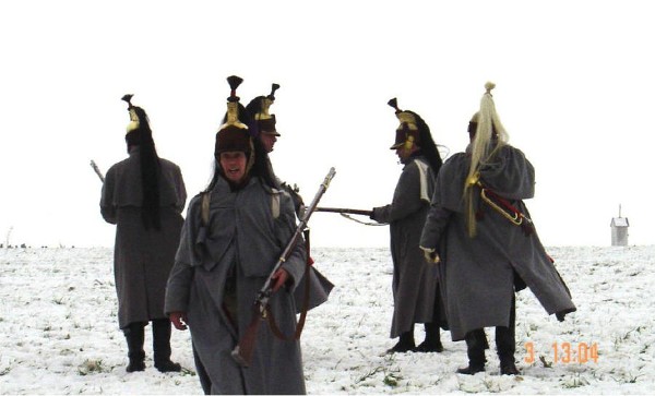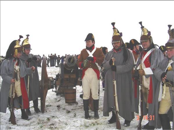 Pour cet événement, notre régiment était constitué de 6 dragons (à cheval et à pied). Nous logions à Stara Posta (la vieille poste) qui était le quartier général de Murat. Les conditions de notre hébergement étaient assez rudes : nous dormions sous une tente chauffée (insuffisamment) par 2 poêles au bois. Dehors, la température avoisinait les -8°. Nous nous sommes levés à cinq heures pour rejoindre le champ de bataille.