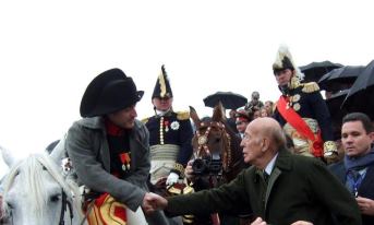 2012: Valéry Giscard d’Estaing serrant la main de l’Empereur Napoléon (Mark Schneider) lors du bicentenaire de la bataille de la Moskova (Borodino) (Photo https://napoleon1812.wordpress.com/2012/11/14/napoleon-at-borodino-2012/)