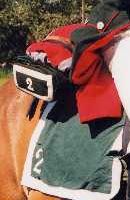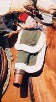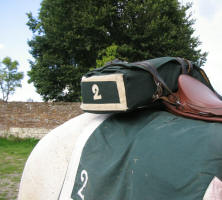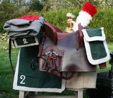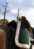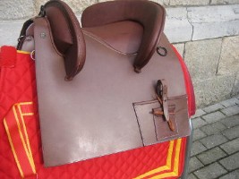 A l’avant de la selle, se trouvent 2 fontes, (sortes de sacoches) recouvertes de « chaperons »: pièces de cuir recouvertes de tissu les protégeant.