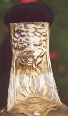 La gorgone qui orne le cimier du casque est une figure de la mythologie grecque à la tête effroyable entourée de serpents.Les Gorgones étaient trois sœurs dont la plus connue était Méduse dont les cheveux étaient des serpents et dont le regard était pétrifiant (de là être médusé = pétrifié).Athéna (déesse de la guerre chez les Grecs) avait orné son égide (bouclier) d’une tête de Gorgone au regard pétrifiant et c’est probablement de là qu’est venue cette tradition d’orner le casque (à défaut de bouclier) d’une tête de Gorgone. Plus d’infos sur les Gorgones.